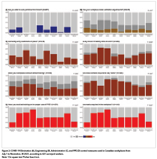 Background: Under the Occupational Health and Safety Act, every person employed in Canada has the right to a safe work environment. Yet, research shows that essential workers in Canada have experienced a disproportionate burden of COVID-19 transmission and deaths throughout the pandemic. In light of ongoing reported COVID-19 outbreaks in Canadian essential sectors and rising national case numbers as of July 2021, this study aimed to examine workers’ perceptions of the prevalence and effectiveness of occupational COVID-19 control measures during the fourth wave of the pandemic in Canada.