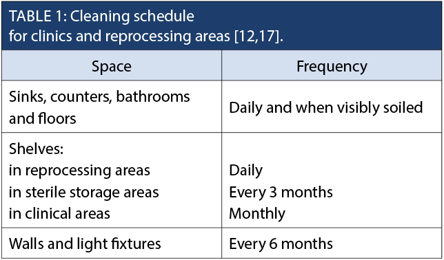 Healthcare providers undertaking reprocessing activities need to understand the potential for cross-contamination in the environment during the course of providing care and during cleaning, disinfection and sterilization procedures. The environment shall be designed to allow for one-way work flow from dirty to clean, with clear separation of clean and dirty instruments [12]. Regular, documented cleaning schedules shall be in place in the following areas: