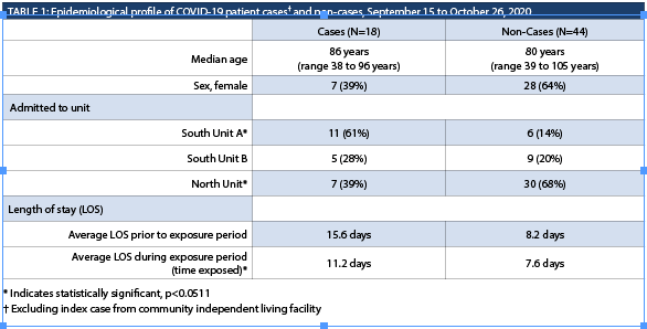 A total of 62 patients were admitted to the units during the outbreak, 18 of whom tested positive for COVID-19 (excluding the index case), for an overall attack rate of 29% (95% CI: 19-41%). While the median age for cases (excluding the index case) was higher than for non-cases, and males were at a slightly higher risk than females, the differences were not statistically significant (Table 1). Patients who stayed on South Unit A were at a higher risk of contracting COVID-19, while patients who stayed on North Unit were at a lower risk. Cases had a higher average number of days at risk on an outbreak unit prior to specimen collection (or discharge) than non-cases.
