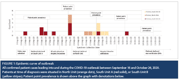 Results: The index case was a patient whose positive status was unknown to staff and whose symptoms on admission did not fit the screening criteria at the time. A total of 19 patients were linked to the outbreak during the study period, with an attack rate of 29%. All-cause mortality for patient cases was 37%. Whole genome sequencing confirmed genetic relatedness of all patient cases.
