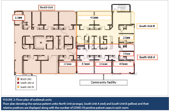 This cross-sectional, observational study was conducted in a 63-bed community hospital in Fraser Health (FH), the largest regional health authority in British Columbia, Canada. The outbreak involved two medical units (South Unit A, with three multi-bed rooms and two private rooms for a total of 14 beds, and North Unit, with four multi-bed rooms, one semi-private room, and one private room, for a total of 19 beds) and one alternative level of care unit (South Unit B, 10 beds across two multi-bed rooms and two private rooms). During the study period, the average community incidence was 6.16 cases per 100,000, and COVID-19 vaccines were not yet available. At the start of the pandemic, the hospital had implemented universal masking and eye protection for all healthcare workers, restricted visitation, and introduced screening for COVID-19 symptoms and exposure risk factors in the emergency department. SARS-CoV-2 polymerase chain reaction (PCR) testing using nasopharyngeal swabs was performed for all patients presenting with symptoms, a history of travel or reported exposure to COVID-19. All suspected and confirmed COVID-19-positive patients were cohorted separately on droplet and contact precautions in dedicated units with dedicated staffing and equipment. In addition, airborne precautions were applied for all aerosol-generating procedures with COVID-19 confirmed, suspected or exposed patients.