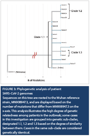 Whole genome sequencing provided valuable information to the investigation and validated the epidemiological data, linking all subsequent patient cases and all but one of the healthcare worker cases to the admission of the index case. Cases genetically related to the index patient signified a very high likelihood that these infections were from a common source at a time when community prevalence was low. In settings where community prevalence is high, whole genome sequencing alone may not provide adequate evidence for a common source, since multiple introductions of the same strain is possible. It is, therefore, important to link genomic data with epidemiological information for proper interpretation.