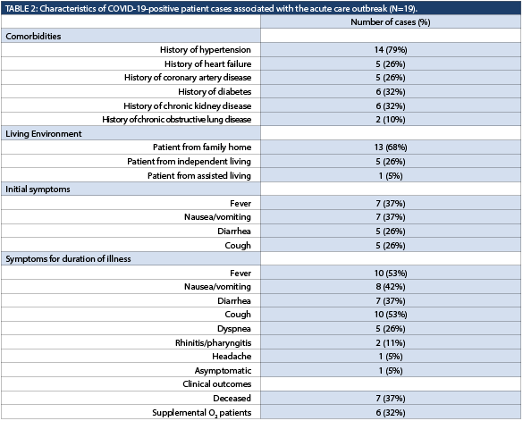 On the advance care directives of the 19 positive patients, nine had opted for all appropriate critical care interventions (full code or CPR-C2), seven wanted only medical treatment in an acute care facility (DNR-M3), two had chosen comfort care (DNR M1/M2), and one did not have a documented code status. Two of the full code patients were changed to DNR-M3 code status, one of whom later died. Thirteen of the COVID-19-positive patients lived in a family home, five resided at an independent living facility, and one from an assisted living facility. The most common comorbidities were hypertension, coronary artery disease, congestive heart failure, chronic kidney disease, and diabetes (Table 2), consistent with age demographics.